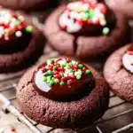 Soft, fudgy Chocolate Thumbprint Cookies filled with silky ganache and topped with festive sprinkles. A beautiful and easy treat for Christmas or any holiday occasion.