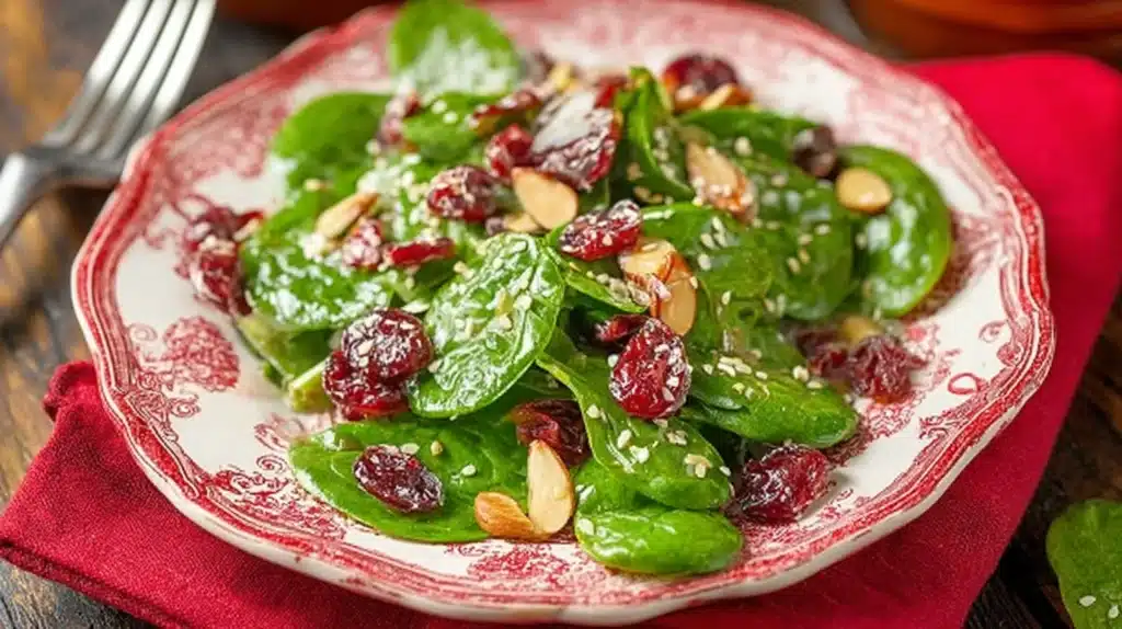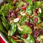 A festive and refreshing spinach salad with dried cranberries, toasted almonds, and a bright homemade vinaigrette. Perfect for Christmas dinner or holiday gatherings.