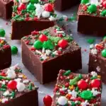 Rich chocolate Christmas fudge topped with colorful holiday sprinkles, perfect for gifting or entertaining.