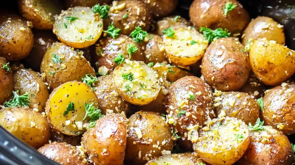 Tender baby potatoes slow cooked with butter, garlic, herbs, and Parmesan. An easy and flavorful side dish for holiday dinners.