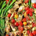 A colorful one-pan pesto chicken dish loaded with tender cheese tortellini, fresh asparagus, and juicy cherry tomatoes for an easy, flavorful dinner.