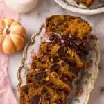 Moist, spiced Pumpkin Chocolate Chip Bread filled with rich, melty chocolate chips. The perfect fall bake for cozy mornings or dessert.