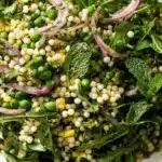 Close-up of spring couscous salad with pearl couscous, peas, arugula, mint, red onions, and pistachios tossed in lemon-herb dressing.